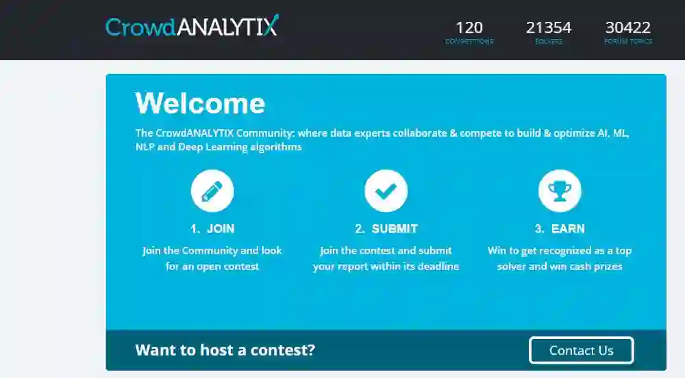 CrowdANALYTIX 是一个众包分析平台,该平台将商业上的挑战和问题转换成竞赛题目。CroudANALYTIX 社区通过合作与竞争的方式来构建和优化 AI、ML、NLP 和 深度学习算法。该平台还有社区博客,其中有包括访谈和参考资料在内的大量资源。