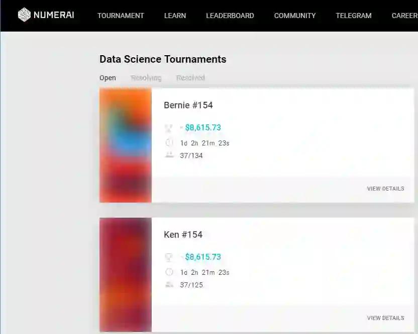Numerai 是由众多数据科学家建立的、AI 运营的众包对冲基金平台。该平台每周都会举办数据科学竞赛以支持真正的对冲基金。Numerai 每周给参赛者提供加密数据,然后参赛者们提交其预测值。之后 Numerai 会根据所有提交结果构建元模型,并进行投资。