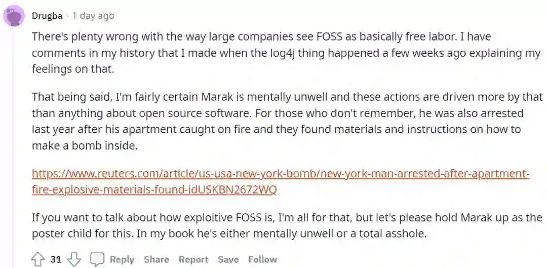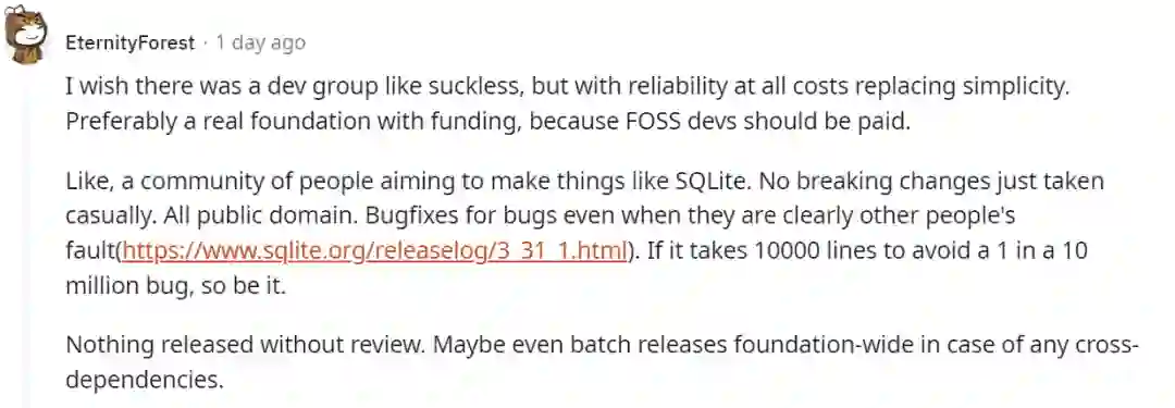 当然,也有人为开源软件(FOSS)开发者的待遇鸣不平:「希望有相关的基金会位 FOSS 开发人员提供资金支持」,而软件的可靠性和稳定性也是至关重要的