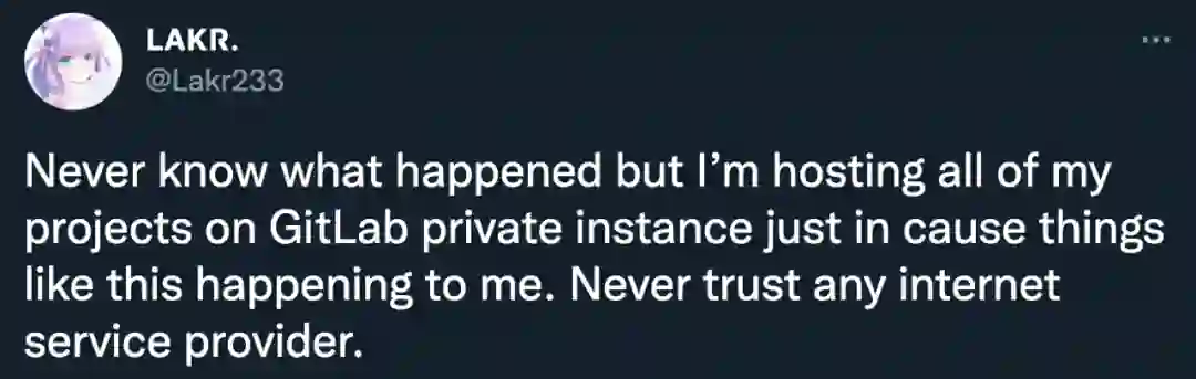 「不知道发生了什么,但我将我所有的项目都托管在 GitLab 私有 instance 上,永远不要相信任何互联网服务提供商。」