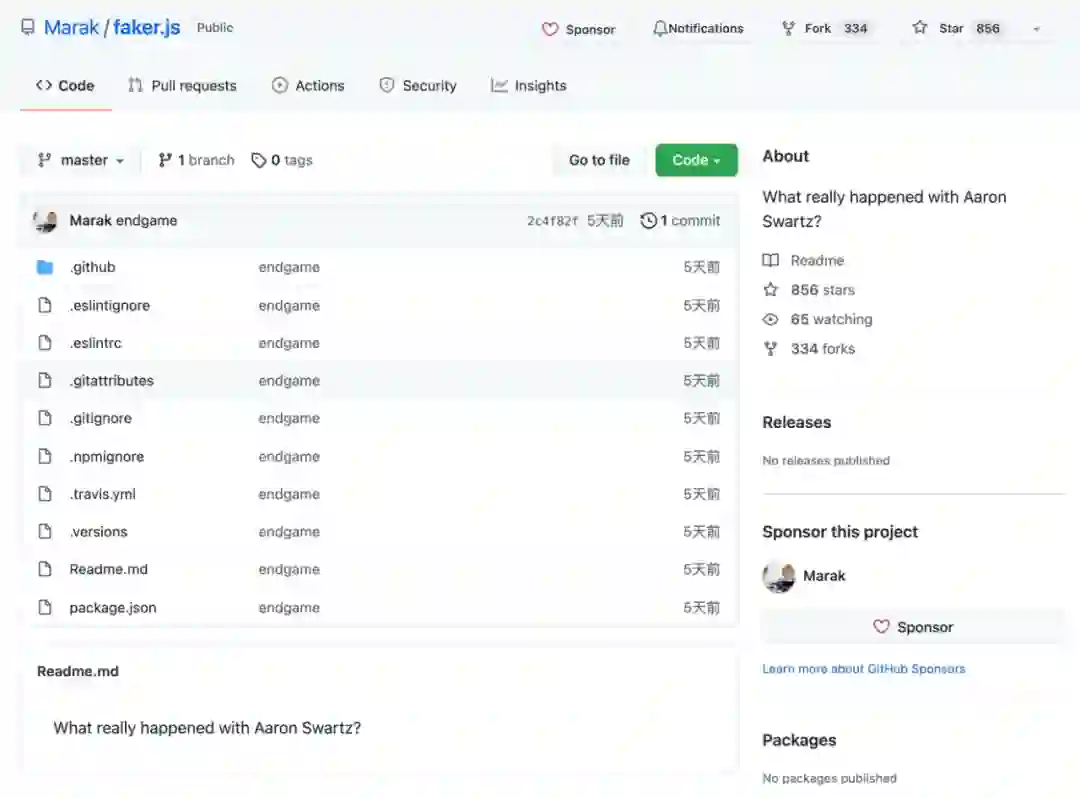 现在,faker.js 项目的所有 commit 信息都被改为「endgame」,在 README 中,作者写下这样一句话:「What really happened with Aaron Swartz?」