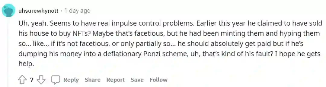 甚至有人认为 Marak 这么做是一种冲动行为,不够理性,并和他之前「卖掉房子购买 NFT」的传闻联系起来,认为 Marak 需要学会控制自己的情绪: