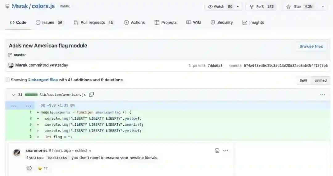 Marak Squires 向 colors.js 提交了恶意代码,添加了一个「a new American flag module」,然后将其发布到了 GitHub 和 npm。