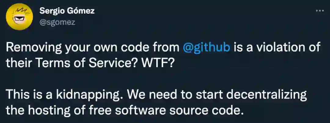 软件工程师 Sergio Gómez 表示:「从 GitHub 删除自己的代码违反了他们的服务条款?WTF?这是绑架。我们需要开始分散托管免费软件源代码。」