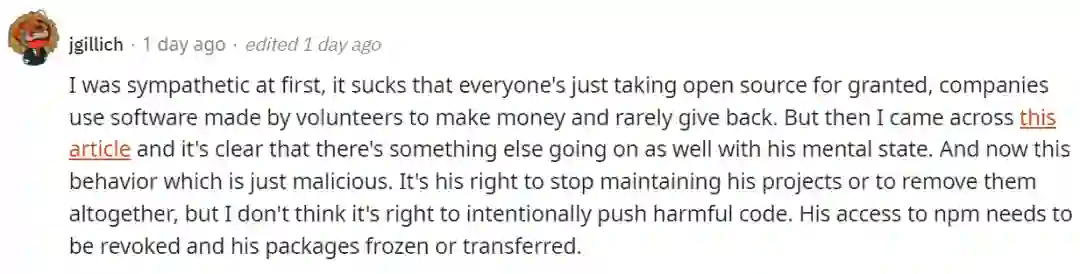 这种说法很快带偏部分网友的看法,有人原本同情开源项目被「白嫖」,但现在已转向认为 Marak 是恶意删库,并指出:「停止维护他的项目或完全删除都是他的权利,但故意提交有害代码是不对的。」