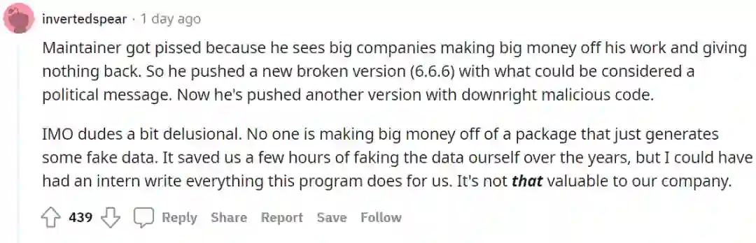有网友认为 faker.js 团队的反应有些夸张了,并说道:「没有人会用一个只生成一些虚假数据的包赚大钱。faker.js 的确为开发者生成伪数据节省了一些时间,但我们也可以让实习生编写类似程序来生成数据。这对企业来说并没有那么重要。」