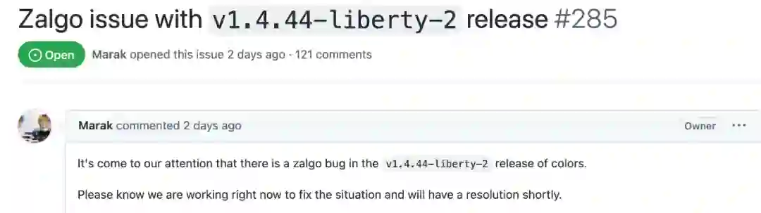 「我们注意到在 v1.4.44-liberty-2 版本的 colors 中有一个 zalgo 错误,」Squires 以一种讽刺的语气写道。「我们现在正在努力解决这个问题,很快就会有解决方案。」