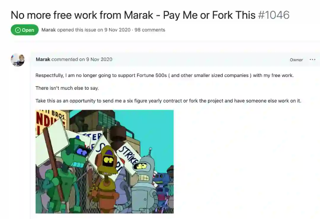 至此,故事并没有就此结束。Squires 2020 年 11 月发在 GitHub 上的一篇帖子被挖出来,在帖子中他写道自己不再想做免费的工作了。「恕我直言,我不想再用我的免费工作来支持财富 500 强(和其他小型公司),以此为契机,向我发送一份六位数的年度合同,或者 fork 项目并让其他人参与其中。」
