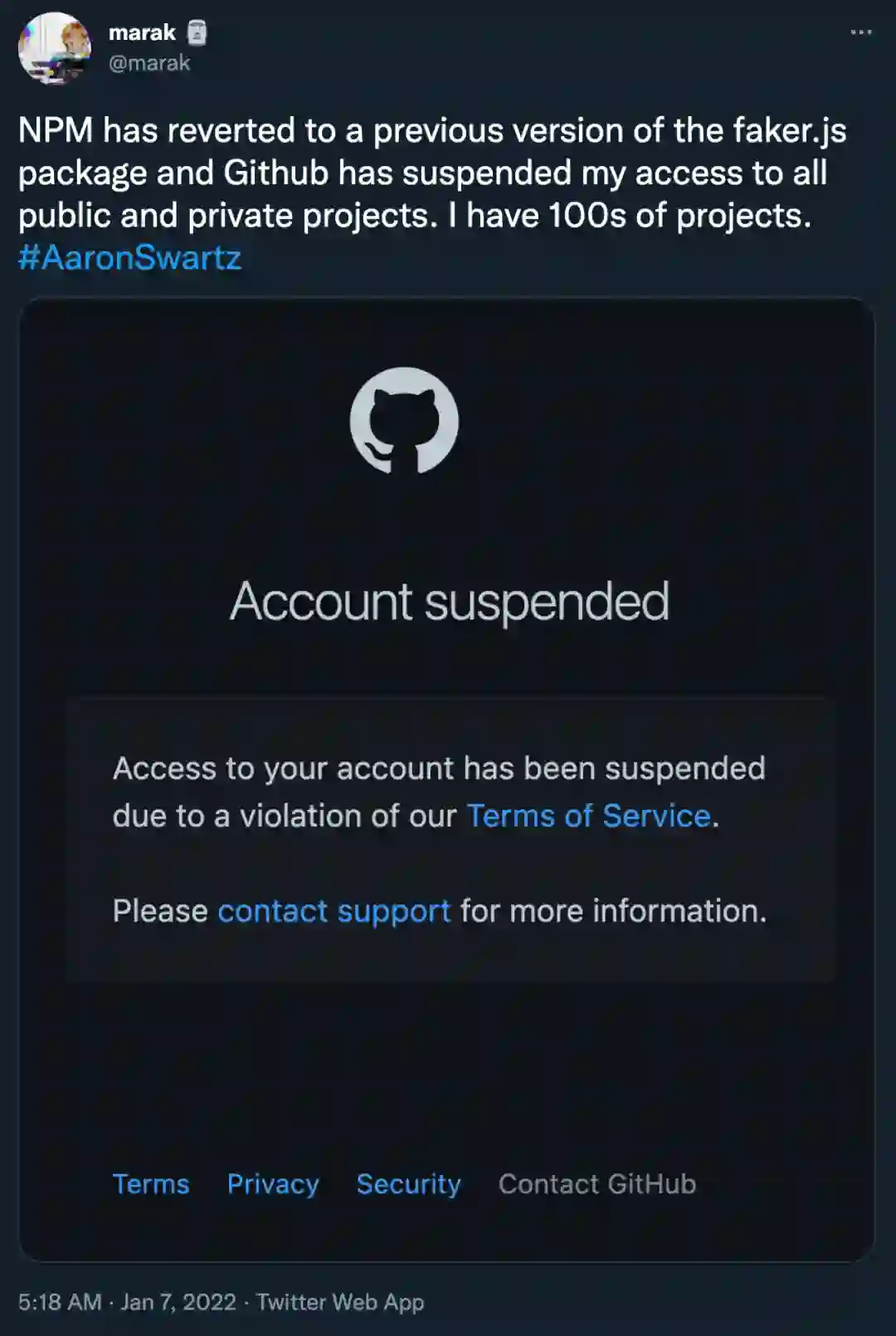 在将更新推送到 faker.js 两天后,Squires 发了一条推文,表示自己存储了数百个项目的 GitHub 账户已经被封。Squires 在 1 月 4 日发布了 faker.js 的最新 commit,在 1 月 6 日被封,直到 1 月 7 日推送了 colors.js 的「liberty」版本。然而,从 faker.js 和 colors.js 的更新日志来看,他的账户似乎被解封过。目前尚不清楚 Squires 的帐户是否再次被封。