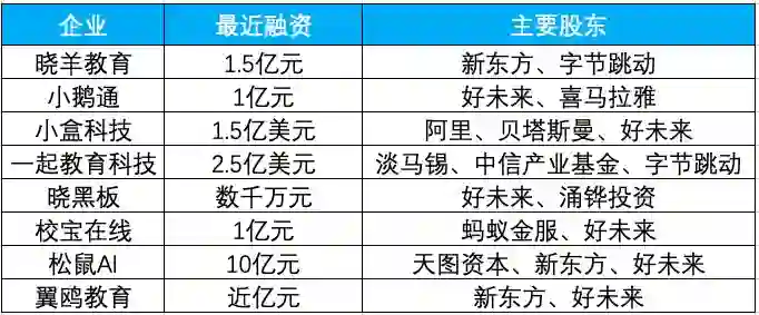和大公司一起想切分公立校蛋糕的,还有一部分创业公司。目前创业公司中相对头部的企业主要分为三类:一类是内容提供商,如小盒科技和一起教育科技,以作业题库工具方式切入,这个领域的玩家还有猿题库和作业帮,但这两家企业还有其他培训业务,所以未单独列举;一类是数据提供商,如翼鸥教育和小鹅通,这次最直接的运用就在于提供直播系统进行教学辅导;最后一类是家校互通类。
