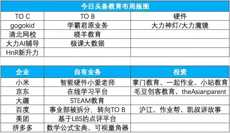 而互联网大公司在进军教育公立校领域时,主要集中在 TO C+TO B 领域,也都分别选择了自己有优势的角度切入: