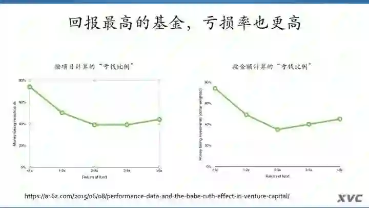 左边这张图里面,由深到浅的三根线,分别是S&P500、头部VC的回报、VC行业的平均回报。VC行业的平均回报,基本和S&P500指数持平,但是波动更大。所以平均来看,投资VC还不如买指数基金。