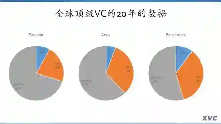 下面我请大家看几个全球最顶级的几个VC的数据,这几家VC是Google、Facebook、Uber等很多“超级鲸鱼”的早期投资人,给投资人创造了上千亿美元的回报,基本每一期基金都有几倍到几十倍的回报。
