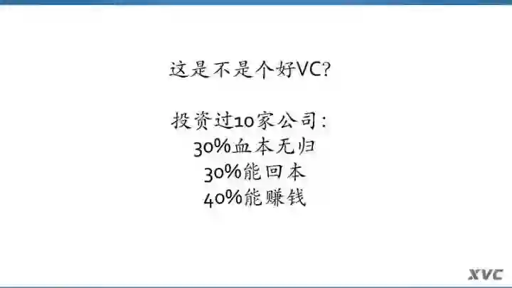 我们再来看一下这是不是一个好VC。他投资过10个公司,30%血本无归,30%能回本,40%能赚钱,这是一个好VC吗?当然基于刚才的信息,好坏都不好说,因为真正有意义的,不是你投的项目有多少能赚钱,而是赚钱的项目能赚多少钱。
