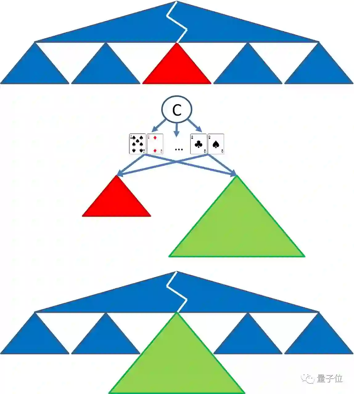 上图是Libratus的子博弈求解过程。顶部表示在对局过程中出现了一个子博弈,中间部分表示算法为这个子博弈制定了更详细的策略,每次迭代中,对手随机发放一手牌,可选的期望值可能来自旧的抽象(红色),也可以来自新的、更精细的抽象(绿色)。如果期望值来自新的抽象,两个玩家的策略都会改变。这就迫使Libratus制定更精细的策略。上图底部表示用新的策略替代旧策略。
