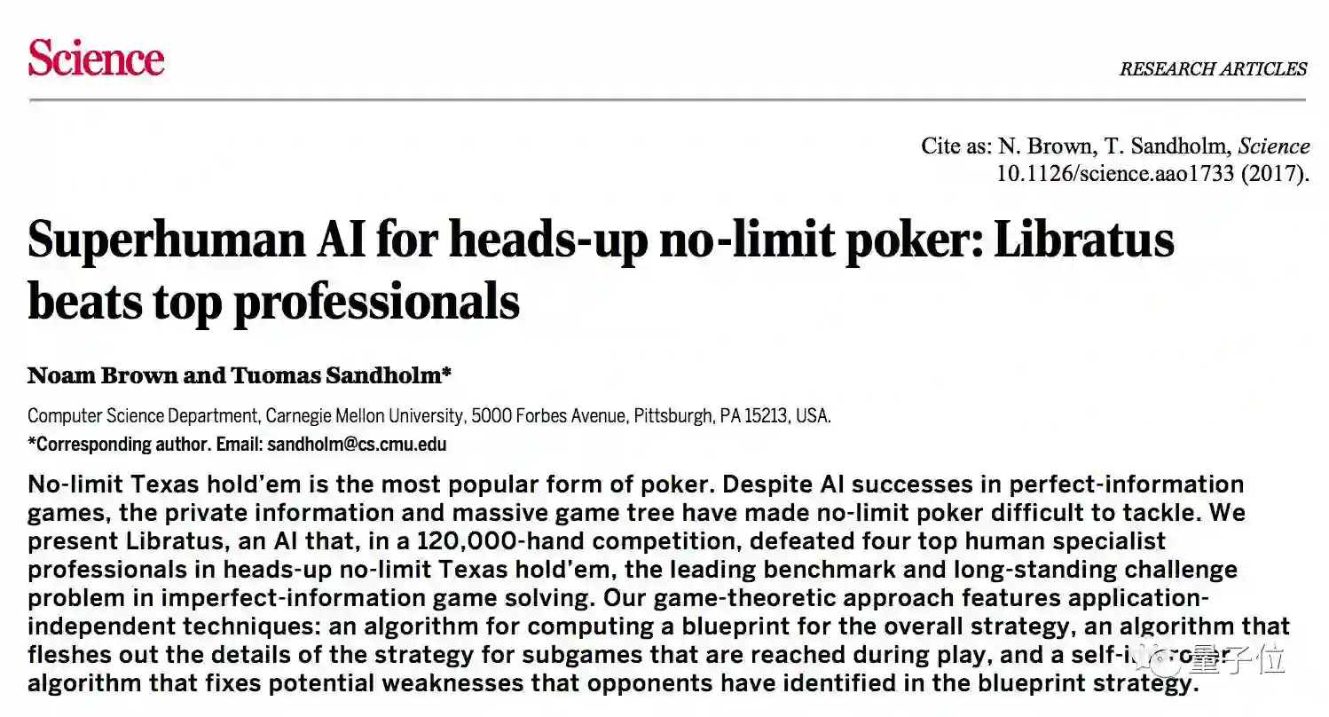 在最新论文Superhuman AI for heads-up no-limit poker: Libratus beats top professionals中,卡内基梅隆大学(CMU)的博士生Noam Brown和教授Tuomas Sandholm,详细介绍了德扑AI如何通过将游戏分解为可计算、可管理的部分,来实现超越人类的表现,而且AI还能根据对手情况,修正潜在的战略弱点。