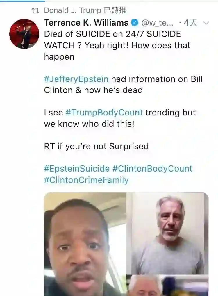 由于这位金融家的「熟人」涉及多国政界、商界、娱乐界的名流,他「明显的自杀」几乎立刻引发了美国人在推特上的阴谋论狂欢。尽管没有任何证据,大家还是把矛头直指美国总统特朗普以及前总统比尔·克林顿,两位都是爱泼斯坦生前的好友。#ClintonBodyCount 和 #TrumpBodyCount 立刻上了推特热搜,各种关于「杀人灭口」的阴谋论伴随着抖包袱的表情包层出不穷。就连特朗普本人也转发了一条阴谋论的推特,这条推特写道,「爱泼斯坦有克林顿的把柄,现在他死了,我们都知道是谁干的。」