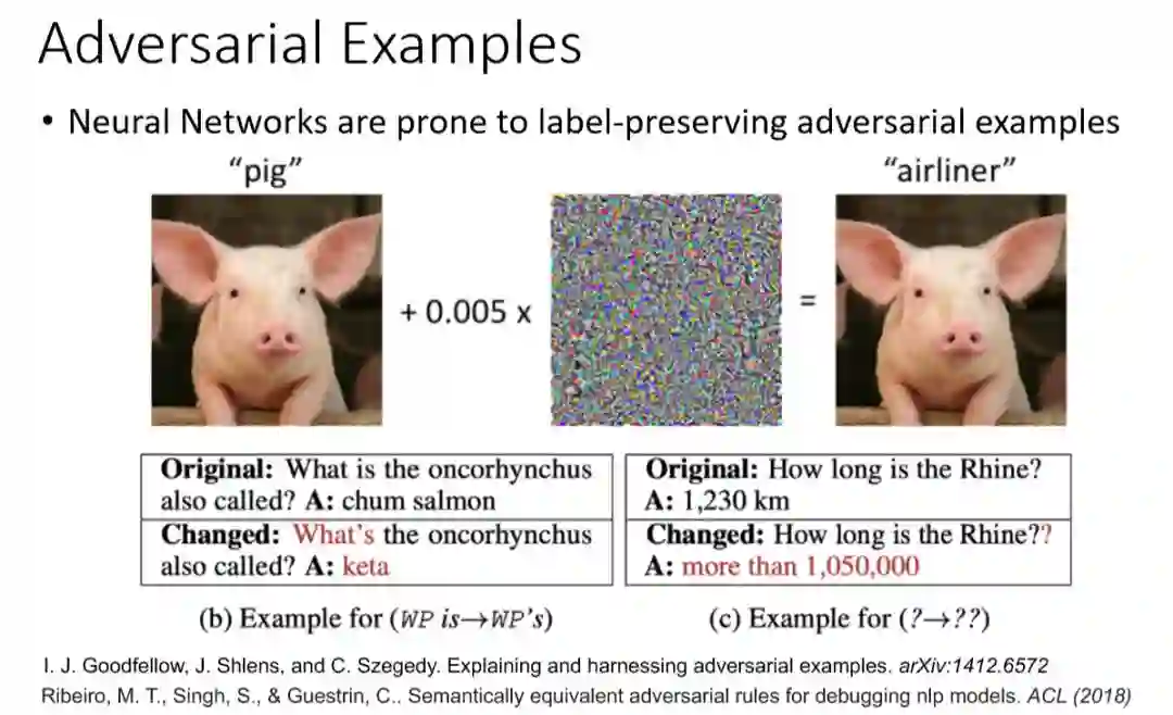 最初的对抗样本概念是基于图像领域,就是我们对一张自然的图片加一个人眼不可见 ( 微小 ) 的扰动,这种扰动不改变图像本身的类别,但是神经网络模型却把他识别为一个完全不同的类别。比如图片中本来是一个"pig",通过加入一个微小的扰动,模型却识别为"airliner"。这种对抗样本对于普通的神经网络来说几乎是普遍存在的,或者说对任意的图片我们都能找到对抗样本使得神经网络模型预测出现错误,利用这种操作我们几乎能使模型在训练集上的准确率降为0;在自然语言中也存在对抗样本,但是构造对抗样本比图像领域要复杂一些,根据Ribeiro在文章中提出的,根据一些词变换的规则 ( Semantically Equivalent Adversarial Rules ) 来生成对抗样本,比如把"What is"改成缩写形式"What's", 或者在语句结束时多加一个问号"?",就能使得基于神经网络的自然语言模型在某些情况下给出一个错误的分类。