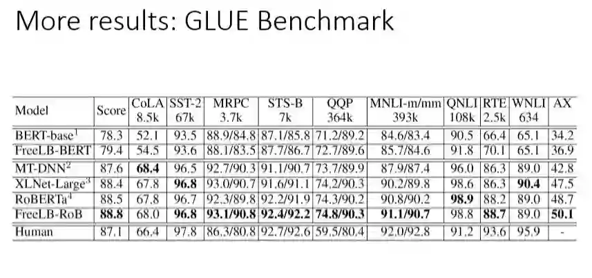 实验中的算法会积累中间对抗样本的梯度,在K步之后更新参数,积累得到的对抗样本的梯度都是使用当前步骤下的参数,避免了FreeAT中参数过期的问题, 所以实验结果性能优于其他对抗训练的模型。并在GLUE很多数据集上都得到了好的结果。