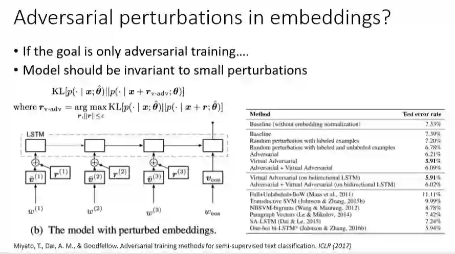 用来增强语言模型的性能,当时通过对抗训练把错误率从7.33%降低到6.21%。后来又提出了一种半监督的训练方式,在原来数据集中增加了一些没有标签的数据,通过最小化无标签数据的KL散度,最小化邻域内最大的KL散度。通过增加无标签的数据之后,错误率由6.21%降低到5.91%。在embedding中加入对抗扰动是目前一种比较有效的方式,我们的工作中也是采用了这种方式引入的对抗扰动。