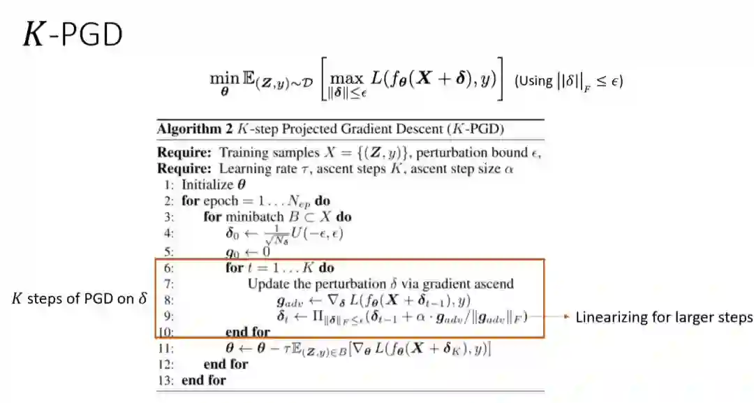 模,乘以单步的学习率,加上前一步的δ值,最后得到的δ都会映射到约束范围内 ( 如果超过ε则取ε值 ),这种normalization的操作是加快模型收敛的速度,因为模型训练趋近最优值附近时梯度比较小,通过这种标准化操作可以增加有效的步长,收敛更快。