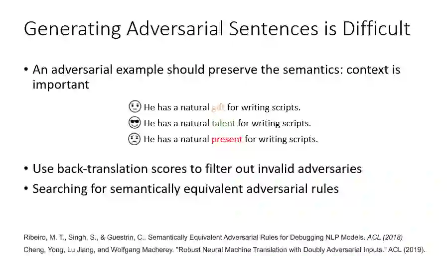 自然语言中生成对抗的句子是有一定难度的,一般最常用的方法,是把句子中的一些词替换成他的近义词。对扰动也采用一种梯度上升的方式,具体做法是通过替换后的embedding向量和原句子的embedding向量求得差向量后,再求与梯度向量求夹角,夹角越小说明对损失函数的增加越多。一般情况下都是通过这种方式结合近义词替换的约束来构造一些对抗样本,但是这种近义词替换与上下文关系密切,所以有时候也存在一些不合理的情况。比如图片中"He has a natural gift for writing scripts."中的"gift",在此句中是"天赋"的意思,第二句中的"talent"也有天赋的意思,但是第三句中的"present"虽然和"gift"也是近义词,都有"礼物"的意思,但是在上下文中确实不合理的。采用这种词替换的方式时还需要结合其他约束方式来过滤掉那些不合理的对抗样本,比如使用back-translation scores,但是这种方式需要使用额外的机器翻译模型,在每次生成对抗样本时检测一次,这种方式的效率非常低;另一种方式就是找一些通用的语言规则,比如缩写 ( what is 替换成 what's ),名词换成指示代词 ( noun>this/that/it ) 等语义等价对抗规则 ( semantically equivalent adversarial rules,简称SEARs ) 方式来生成对抗样本。