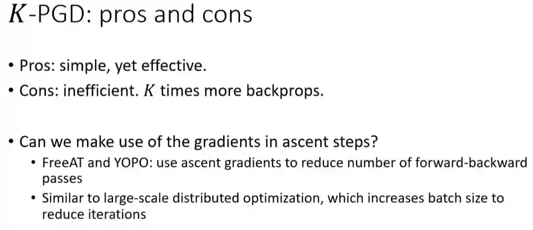 ),一般是这些梯度的平均值。这种做法有点类似于通过增大batch size的方式来加快模型的收敛。YOPO训练速度比其他对抗训练方式要快很多,准确率相比FreeAT也有提升,同时也提升了模型的鲁棒性 ( 防御攻击能力 )。最后文章并未指出通用的规则来表示具体减少的循环次数,只是发现用了更少的循环次数,得到了更好的结果。
