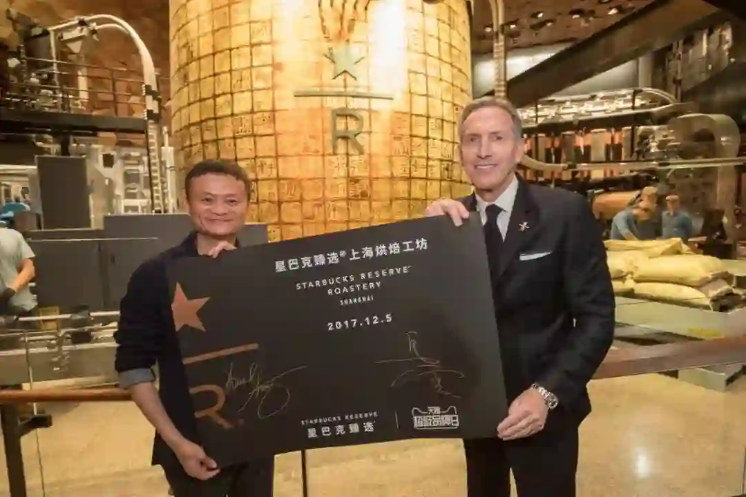 2009年,舒尔茨现身APEC中小企业峰会并发表演讲,就是应马云之邀;2016年初马云礼尚往来,专程到成都为星巴克员工大会“捧场”,而在烘焙工坊的开业中,舒尔茨等待迎接的神秘嘉宾正是马云,后者从当天结束的世界互联网大会匆匆赶来,从当时的直播可见,两人相谈甚欢,中间还进入会议室有过“密谈”。