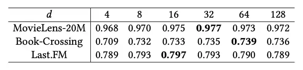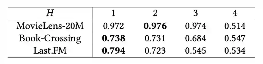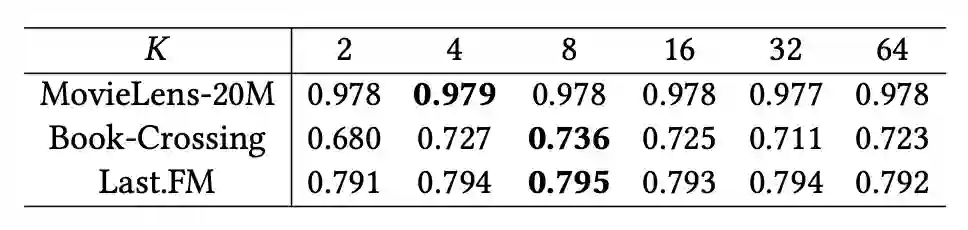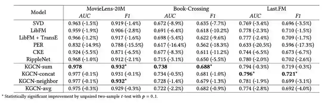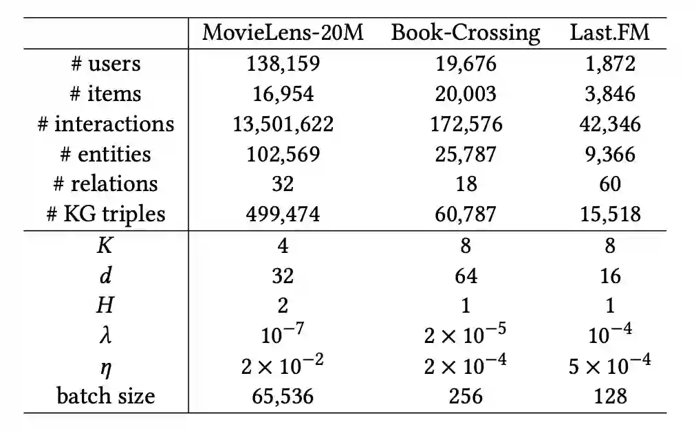 数据集:包括 movieLens-20M,Book-Crossing,Last.FM,用 Microsoft Satori 进行对齐,丢掉了多个匹配的和没有匹配上的 item。数据集统计如下: