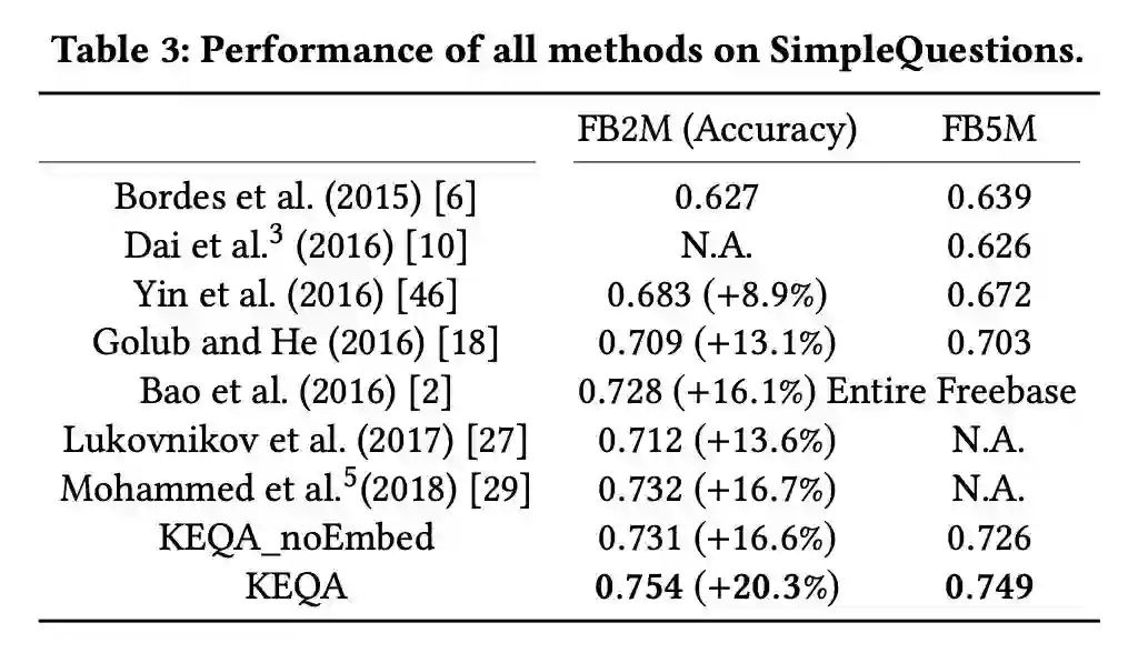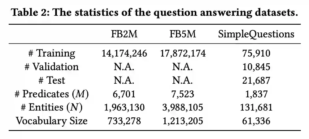 由于去解决的是简单问题,因此所用到的数据集为 Freebase,其中 Freebase 的子集 FB2M 和 FB5M 以及 FB2M 的子集 SimpleQuestions 这三个数据集的数据量以及一些其他特征见下表:
