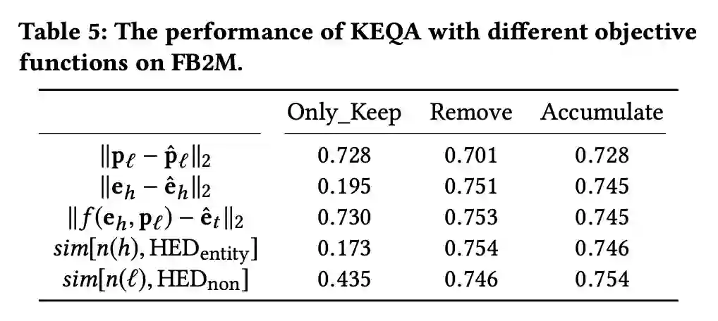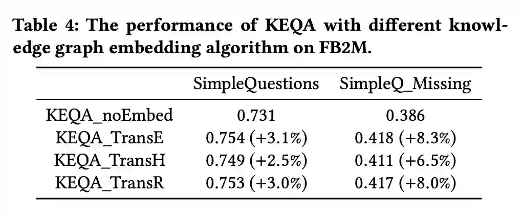 如果对于使用了不同的预训练模型,比如 TransE/H/R 之间的性能区别,以及预训练的 KG Embedding 对 QA 问题的性能提升可以在下表中看出,对于 noEmbed,也就是使用随机初始化的向量值作为实体和关系的 Embedding(在距离度量时也采用该 Embedding),由于随机初始化的结果服从均匀分布,因此问题退化为一个基本的分类问题。