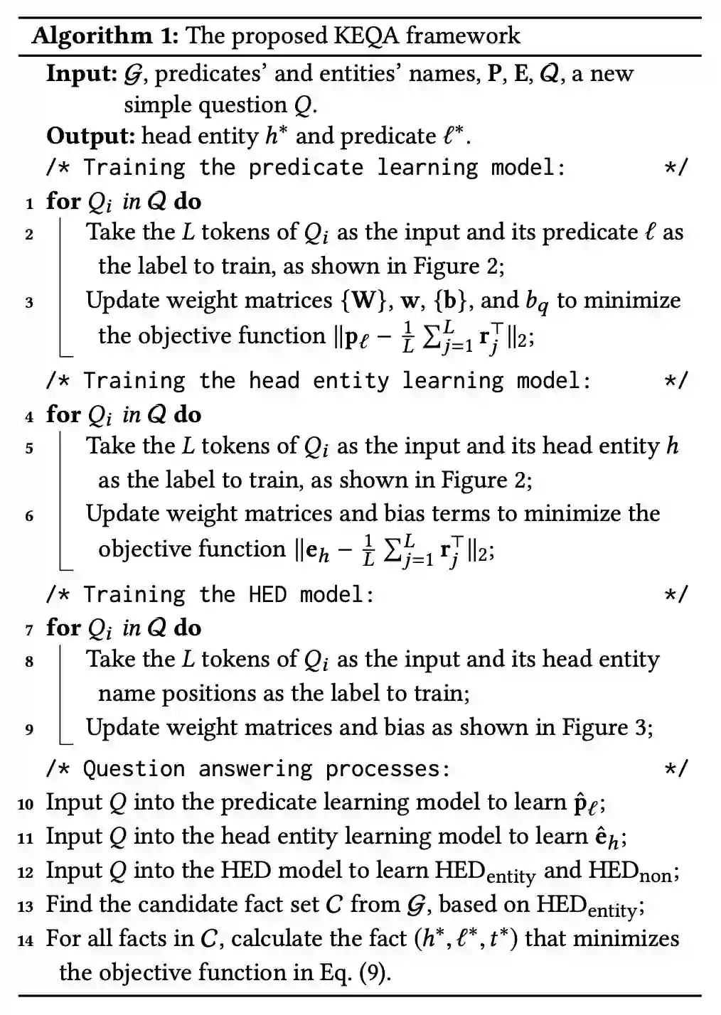 第四项和第五项分别表示头实体和关系的字符串与 (3) 部分提取出的问题中可能为实体的单词之间的相似度。至此总的 KEQA 流程结束。其算法表示如下: