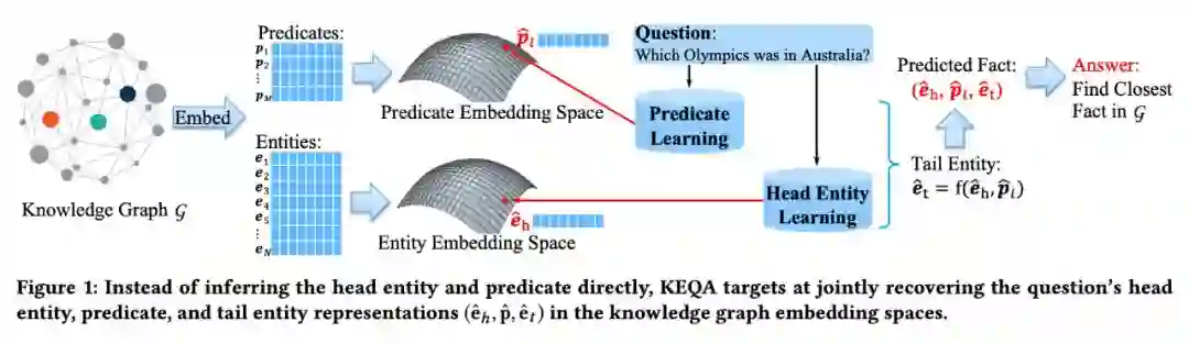本文提出了使用预训练 KG Embedding。再使用神经网络将问题空间映射到 KG 空间的 Embedding,并将这二者进行距离度量,取出距离最小的预训练 Embedding,从而得到问题的答案头实体和关系的方法。