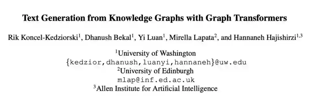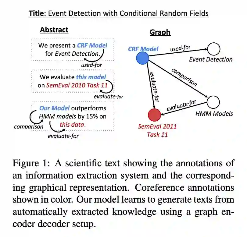 本文实验所使用的训练数据来自 AGENDA(Abstract Generation Dataset,摘要生成数据集,科技论文领域),作者利用 SciIE 信息抽取系统,将摘要中的实体/关系识别出来,作为节点构建知识图谱,过程如下图所示。
