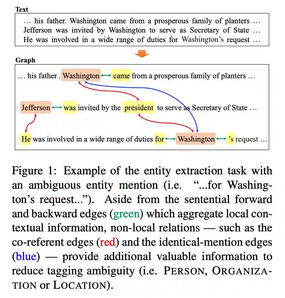 例如,从文档中提取实体时,各种类型的非本地情境信息,如共同引用和相同的提及可能提供有价值的线索。参见下图,其中非本地关系对于区分第二次提及的实体类型至关重要:华盛顿(即人,组织或地点)。