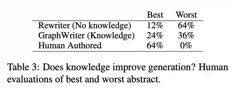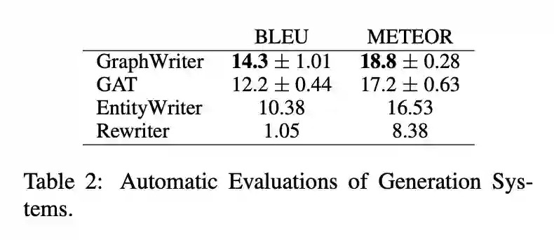 作者考虑了人工评价与自动评价两种评测机制,自动评价方法选择了常见的 BLEU 与 METEOR,用于反映生成文本相对参考文本的 n 元文法相似程度,对比系统与结果如下表所示。