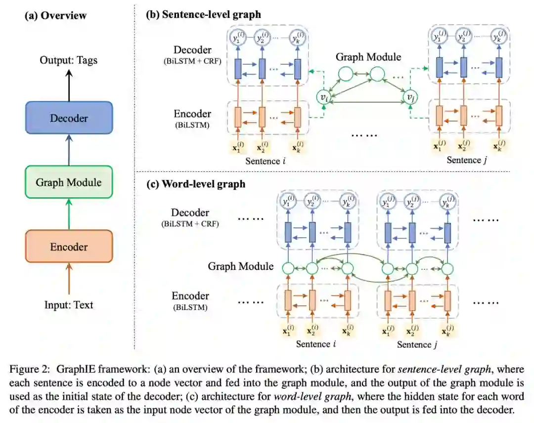 本文提出了 GraphIE,这是一个通过自动学习输入空间中本地和非本地依赖关系之间的交互来改进预测的框架。它将图网络和编码器-解码器集成在一起,构建了序列标记的体系结构。模型如下: