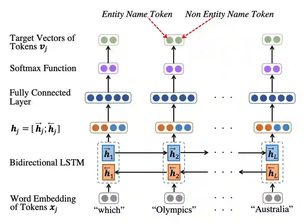 首先,单词经过一个 Bi-LSTM 后,直接进入全连接层,再通过 SoftMax 得到一个二维的向量,其中第一维表示这个单词是一个实体的概率,第二维表示不是实体的概率。