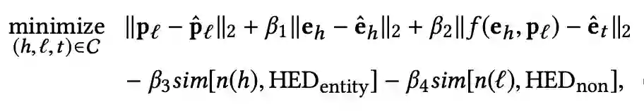 其中,(h, l, t) 表示候选的三元组,度量项的前三项分别为输出的头实体、关系、尾实体和预训练的头实体、关系、尾实体之间的欧氏距离。