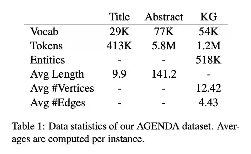 AGENDA 数据集的相关统计参数如下图所示,作者将数据集切分为 38720 规模的训练集,1000 验证集与 1000 测试集。