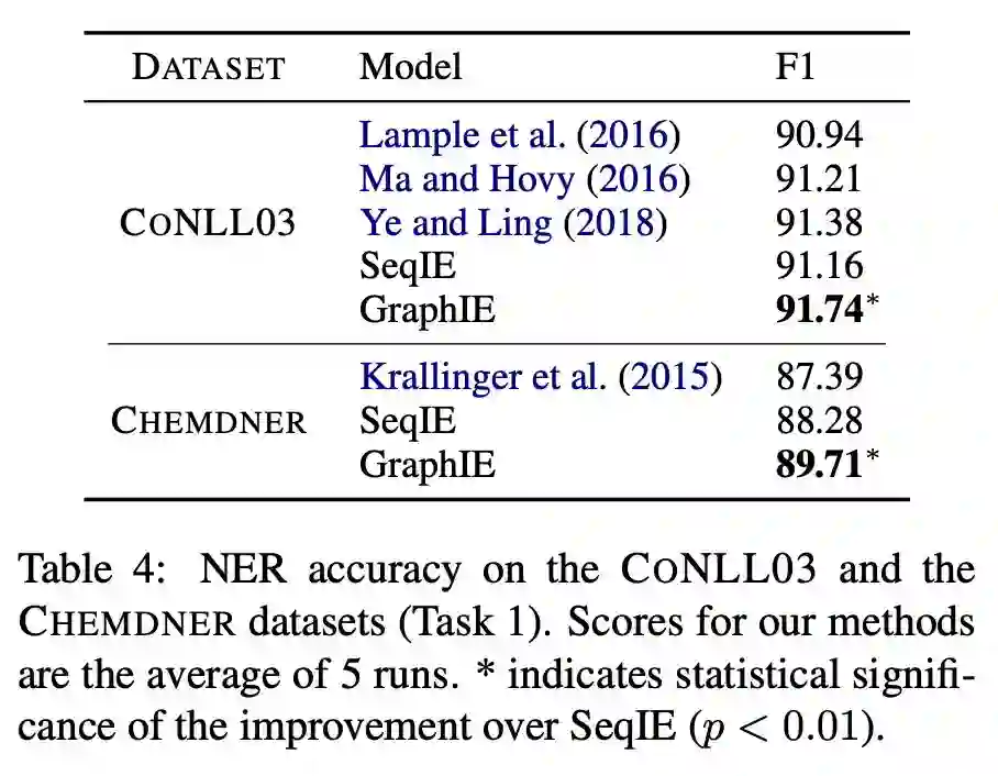 使用 CoNLL-2003 和 CHEMDNER 数据集,实验结果如下。