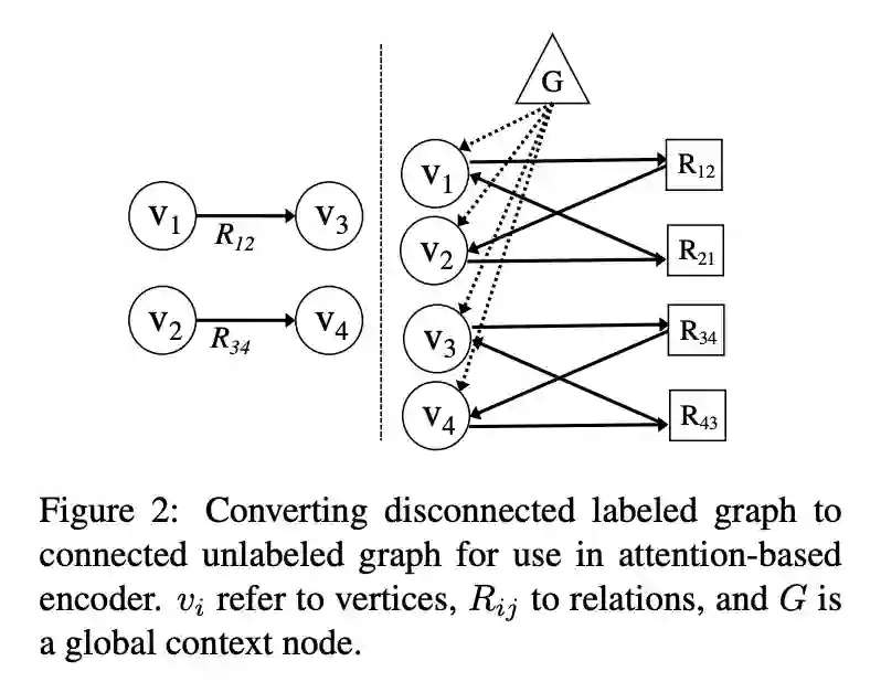 预先准备为了进行编码,作者将图谱重构为一种无标注的连接图,实体和关系都为图中的节点,下图左为一般的知识图谱三元组形式,右边为重构的图结构。可以看到,每个三元组都被替换为两个“实体->关系/关系->实体”的有向图,同时为了保留未连接实体之间的信息流(information flow),作者设置了一个全局结点 G 指向所有的实体节点。