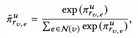 2. 计算 user u 和 KG 中 relation r 的得分,表示用户 u 对关系 r 的重视程度,如:一些用户更注重某部电影的导演而非演员;