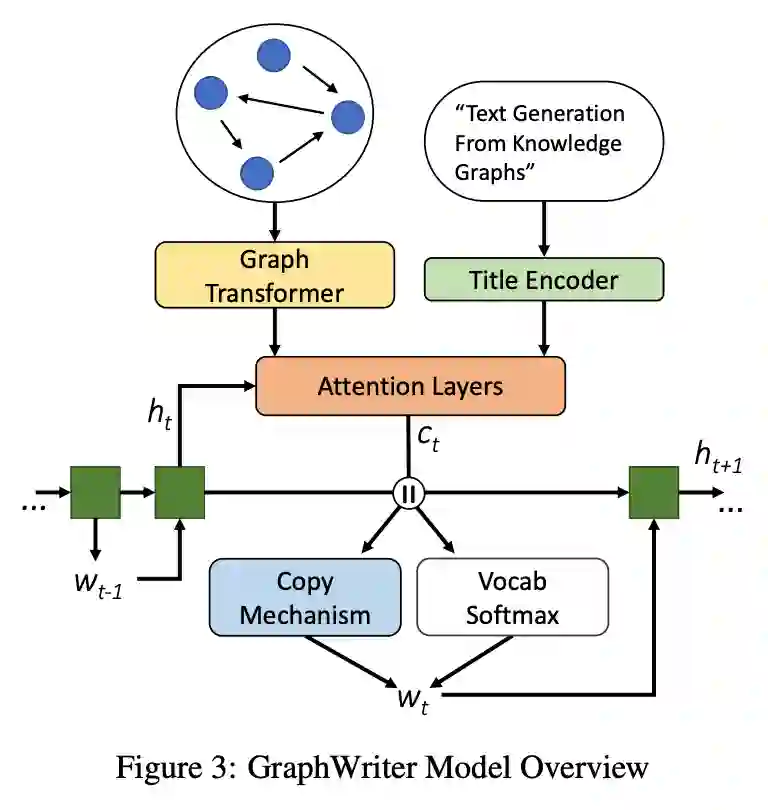 End2End 文本生成整体上还是由编码和解码两个部分构成(如下图),其中,编码结果由两个编码输入整合得到,分别为图谱编码(来自 graph transformer)与主题/标题(Title)编码(来自 biRNN)。