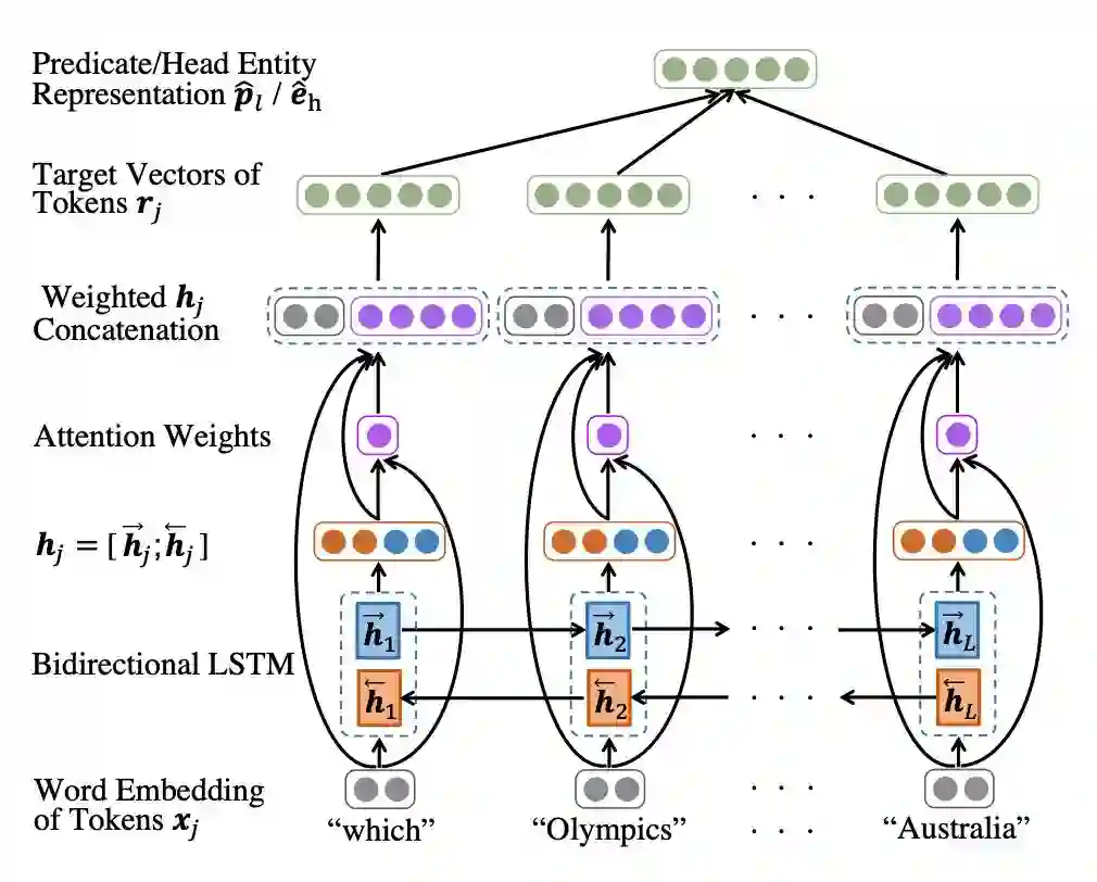 将问题通过 Bi-LSTM 转化成为 d 维度的向量。随后经过 Attention 层并与原单词的 Embedding 做合并操作,在经过一个全连接层得到该单词映射到 KG 空间的 Embedding,将所有的向量作加权平均,最终就可以得到问题转化成为的头实体向量或者是关系向量(注意转化到头实体和转化到关系使用的是相同的神经网络架构)。