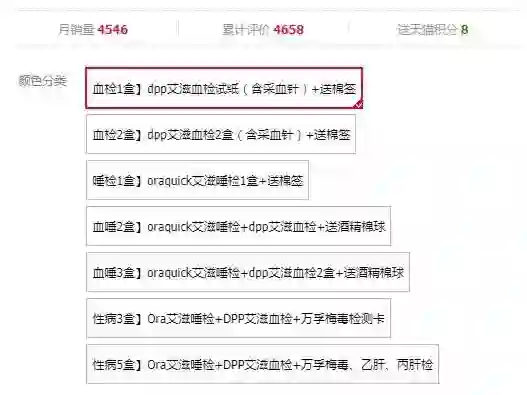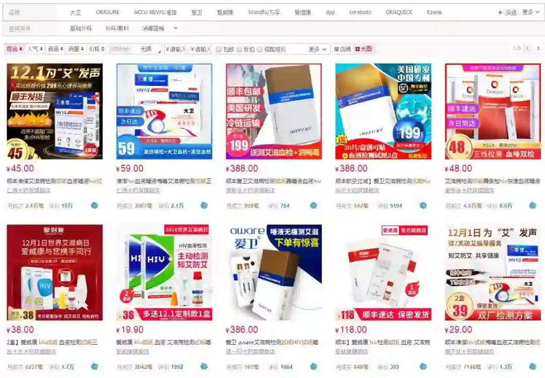 考虑到隐私性,目前大家自检通常都以网络购买为主。根据医谷从阿里健康获取的消息,2018年以来,用户在淘宝搜索“HIV”的次数较去年同期增长了100%,在阿里健康天猫平台购买HIV检测试纸的订单则超过了200万单。医谷在天猫搜索HIV或HIV试纸,显示提供该服务的商品超过数百个,价格从几十元到几百元不等,都可以类似验孕棒的方式自行完成检测,各个店铺的月销量从几十件到上千件不等。产品包括唾液检测、血液检测等,同时很多产品为了提高竞争力,往往会将更多性病、传染性疾病进行延展和组合,如淋病、梅毒、乙肝、丙肝等。