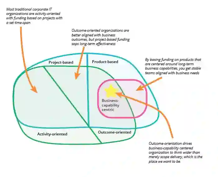 微服务的另一个特点在于Product over Project,这需要不同于传统投资组合的预算管理与团队组建。传统的项目制将预算分配在相对短期的服务开发过程中,项目团队关注的是如何将业务范围(scope)实现,开发结束后服务转交运维团队进行维护,项目团队则被解散进行其他项目的开发。将微服务作为产品运营则需要建立业务结果导向的稳定产品团队。服务的设计不只聚焦于当下需求,更需要考虑价值定位和产品愿景。工程团队则需要思考如何用有限成本支撑非线性的业务接入增长。