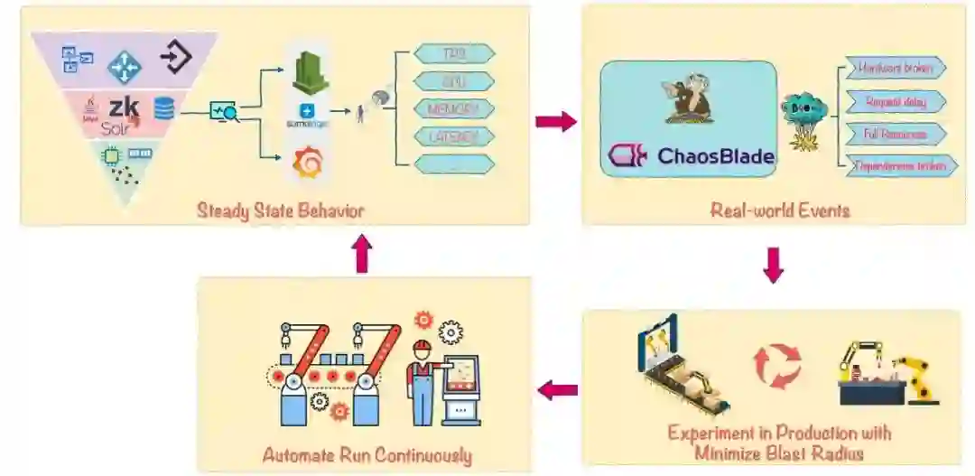 混沌工程类似于“故障演练”,不局限于测试,而更像是工程实践。为什么这么说,通常的测试用例会有“期望结果”和“实际结果”,通过将两个结果比较,或者对用户行为的预期,来判断测试通过或失败。而混沌试验类似于”探索性测试“,试验本身没有明确是输入和预期结果,通过对系统和服务的干预,来观察系统的”反应“。我们将混沌工程原则融入在试验过程中:在生产环境小规模模拟系统故障并定期自动化执行试验,通过试验结果与正常结果进行比对,观察系统”边界“。