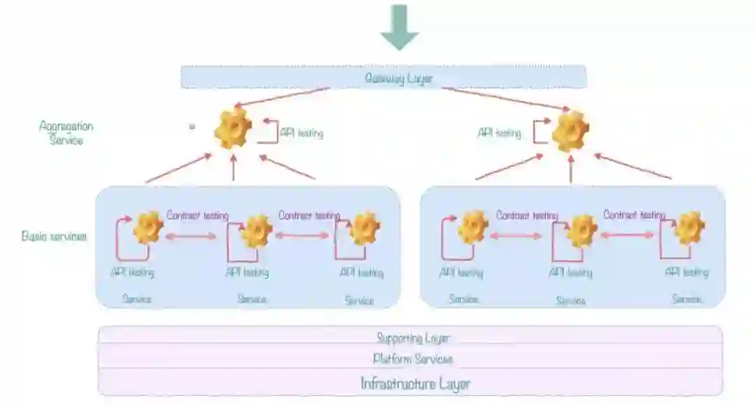 下图,我们聚焦于微服务架构的业务服务层,在API测试之外在基础服务的调用方和提供方之间增加了契约测试: