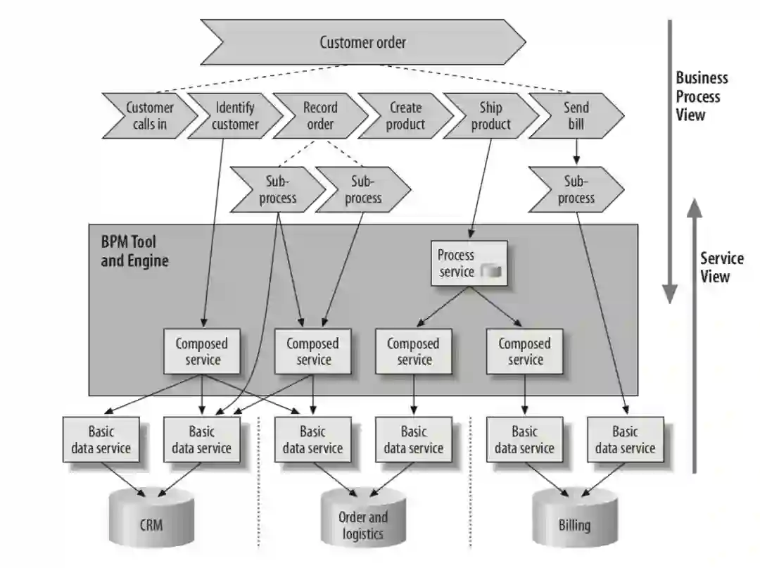 早期的服务只是单纯的技术构件,大多数组织从纯粹的技术实现角度考虑服务的划分。SOA的推动者们指出企业的信息资产应该被复用,信息孤岛应该被打通。通过将不同的服务编排组合,我们应该能够实现IT对业务更加灵活的支撑。